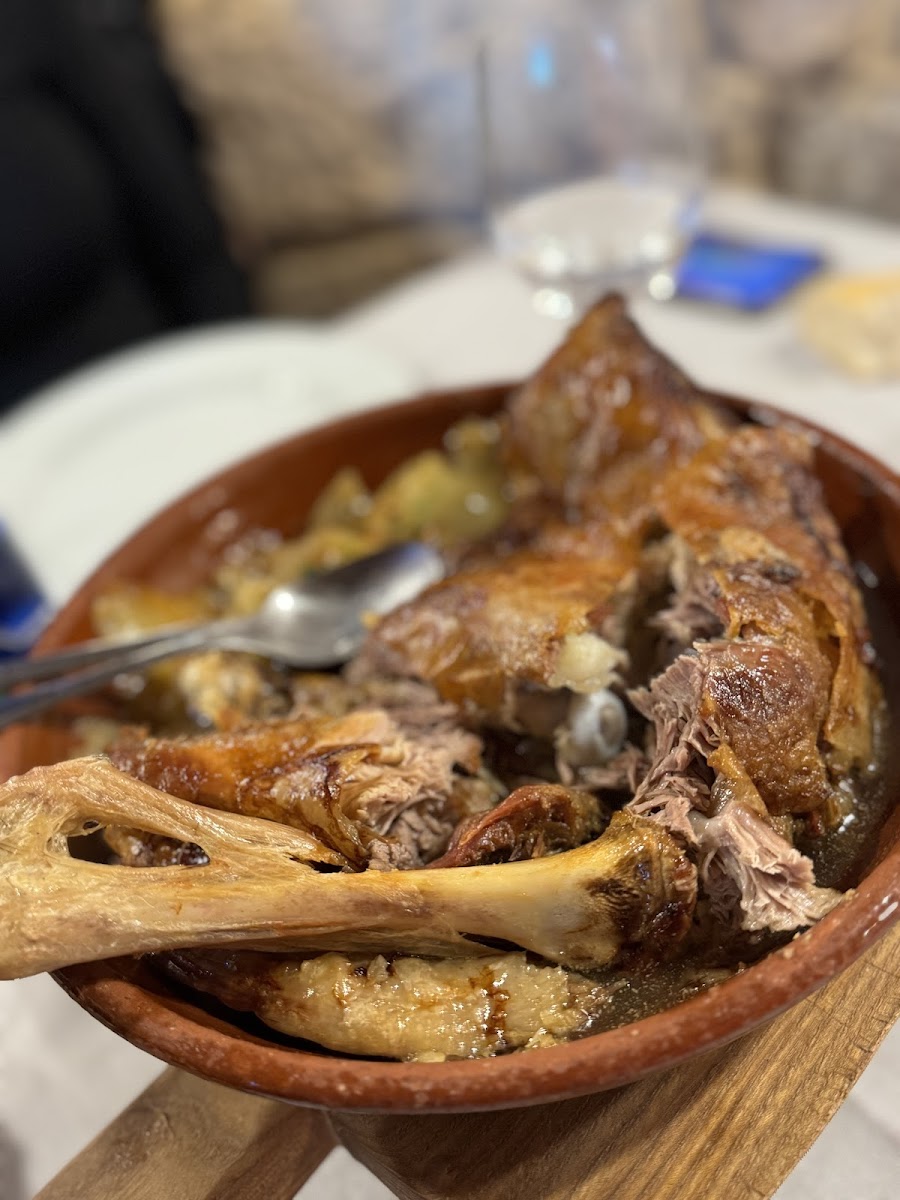 Estuvimos visitando el pueblo y decidimos comer aquí porque tenía muy buena pinta. Es un sitio muy acogedor. Comimos muy bien y nos atendieron mejor. Pedimos de entrante un caldo, que para el frío venía muy bien, y una ensalada de cabra. En mi opinión un tanto pequeña, pero estaba deliciosa, con granada, fresa, arándanos… buenísima. Y para compartir pedimos cordero. Qué os voy a contar! Mejor probadlo. Y lo que nos sorprendió fue el pan, que era torta de Aranda y nos lo sirvieron calentito. Súper súper bueno. Además, tiene una terraza que en verano se tiene que estar increíble.